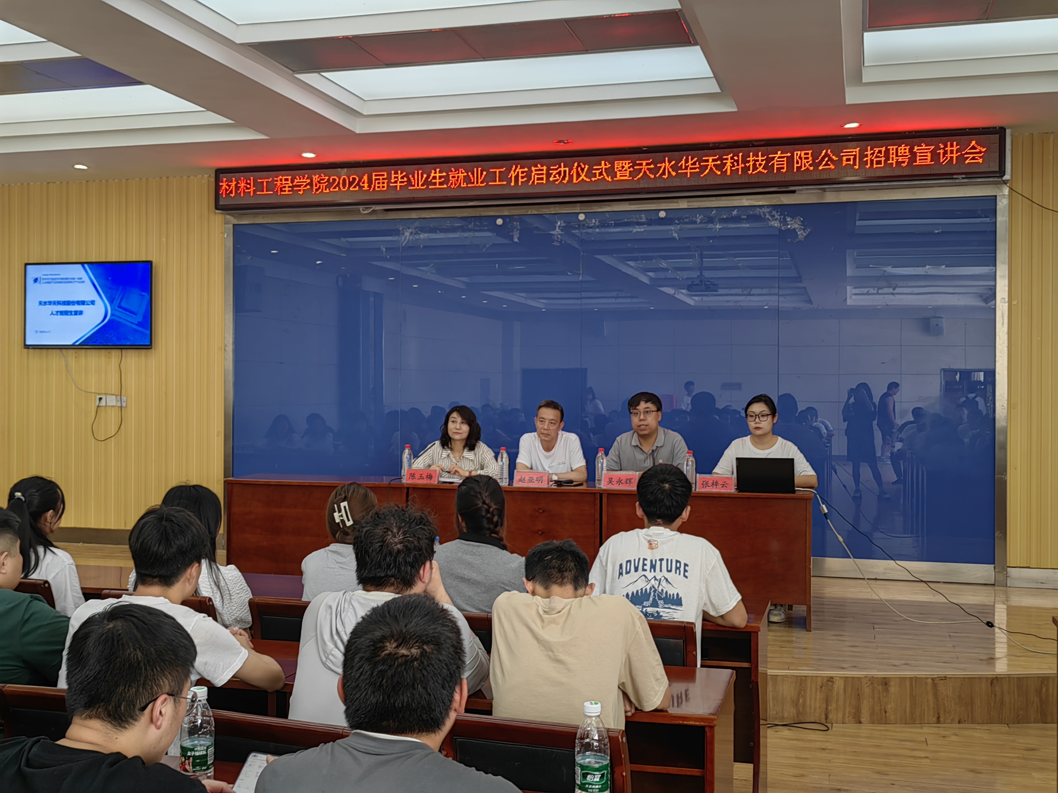 6月17日下午,材料工程学院在第一学术报告厅举办2024届毕业生就业工作启动仪式暨天水华天科技有限公司招聘宣讲会。天水华天科技股份有限公司校企合作办公室副主任吴永辉、专员张梓云,学院党委书记赵亚明,党委副书记、副院长陈玉梅,百余名2024届毕业生参加会议。