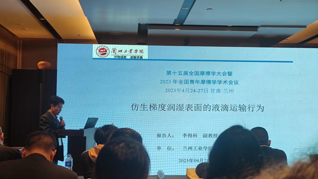 4月25日, 第十五届全国摩擦学大会暨全国青年摩擦学学术会议在兰举行。我校材料工程学院李得科博士应邀参加并作题为《仿生梯度润湿表面的液滴运输行为》的报告,全面阐述仿生梯度润湿表面的液滴运输行为的机理。