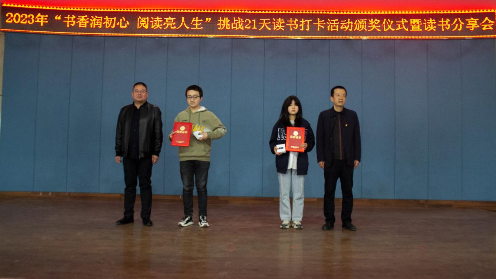 4月23日,2023年“书香润初心·阅读亮人生”挑战21天读书打卡活动颁奖仪式暨读书分享会在八楼会议中心召开,图书馆馆长张振宇、校团委书记王斌、学生处副处长王永喜、各校级学生组织负责人、各学院学生会主席团成员和受表彰学生共计300余人参加了本次活动。