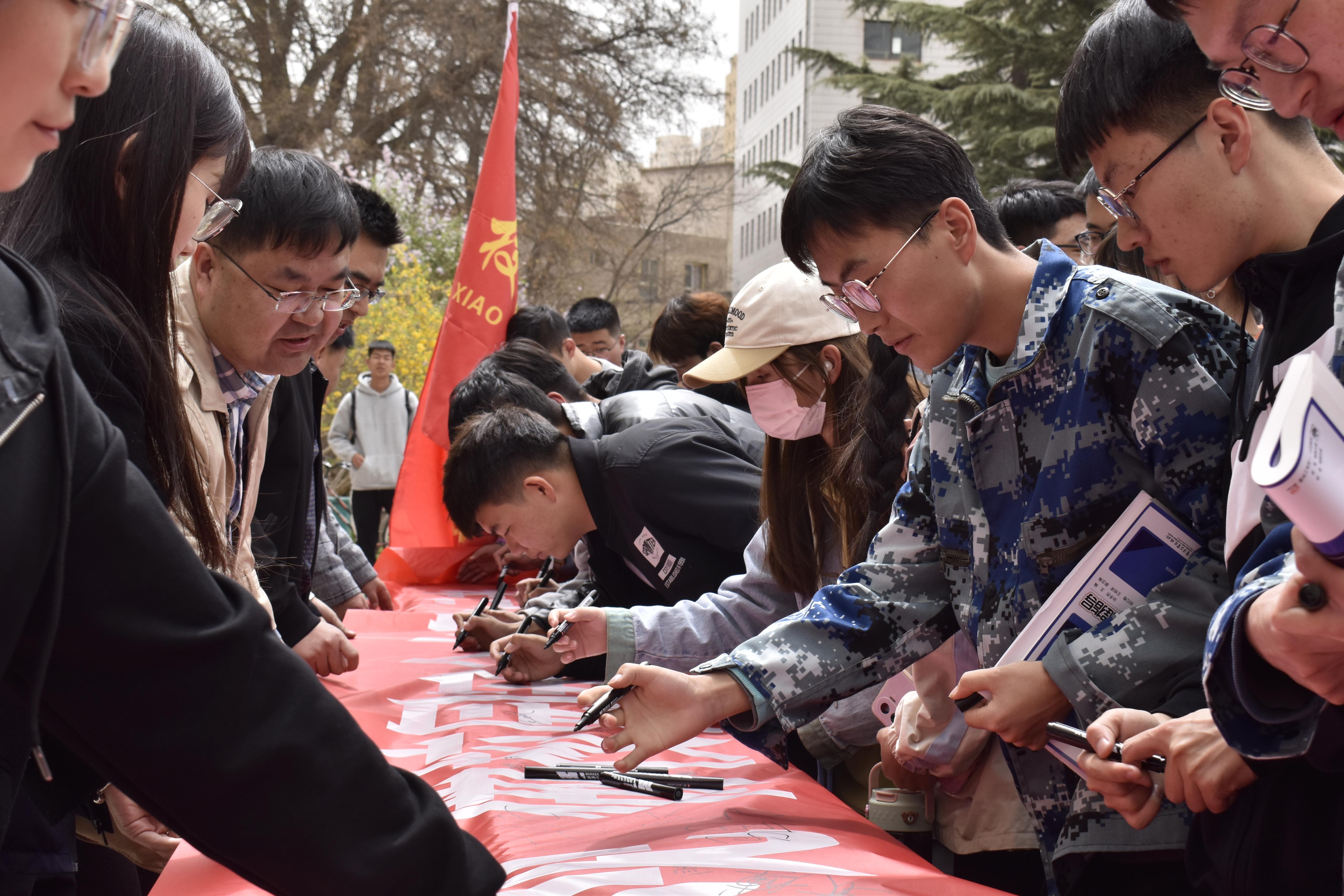 4月13日,学生处在北校区餐饮中心门前小广场举办 “4.15”全民国家安全教育日宣传暨现场签名活动,学生处副处长王永喜、保卫处副处长王铮、公寓中心副主任张磊,学生处、校团委相关教师,以及300余名青年学子参加活动。