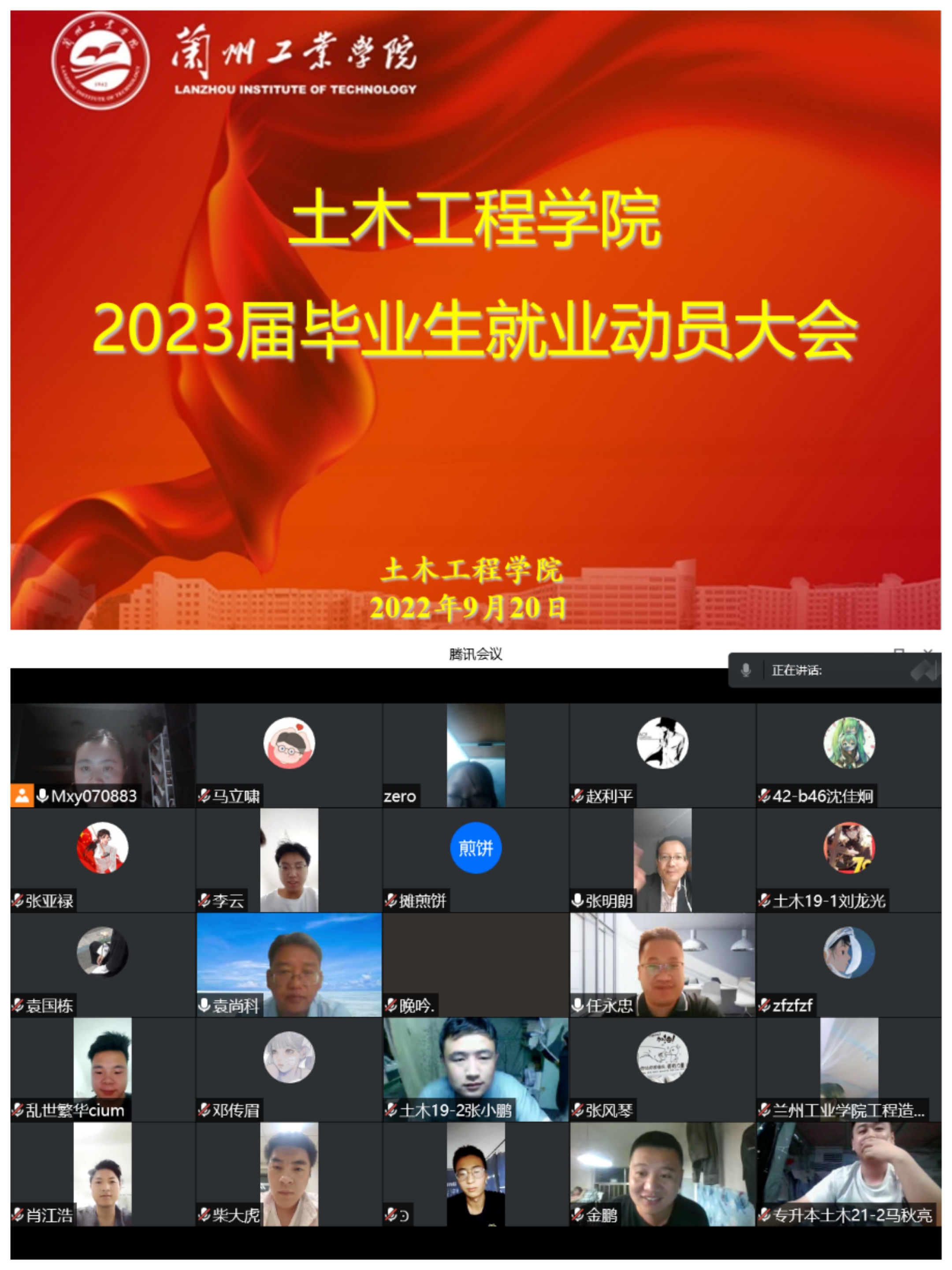 9月20日晚,土木工程学院通过腾讯视频会议召开2023届毕业生就业动员大会。学院党委书记张明朗,院长袁尚科,党委副书记、副院长任永忠,院办主任、辅导员、班主任以及2023届全体毕业生参加了会议。