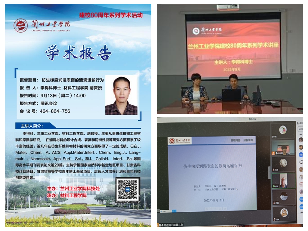 9月13日下午,材料工程学院举办线上学术报告会。科技处副处长岳武,学院全体师生参加报告会,会议由材料工程学院院长余华俐主持。 材料院副教授李得科博士以《仿生梯度润湿表面的液滴运输行为》为题,结合自身研究经历,紧扣研究方向,详细阐述课题背景、研究意义、研究方法,分享了科研经验,并展示了最新科研成果,他鼓励大家保持对科研的热情,潜心投入学术研究。 此次学术讲座,是建校80周年学术交流活动之一,为师生提升学术素养提供了平台,进一步开拓了师生视野,营造了良好的学习氛围。