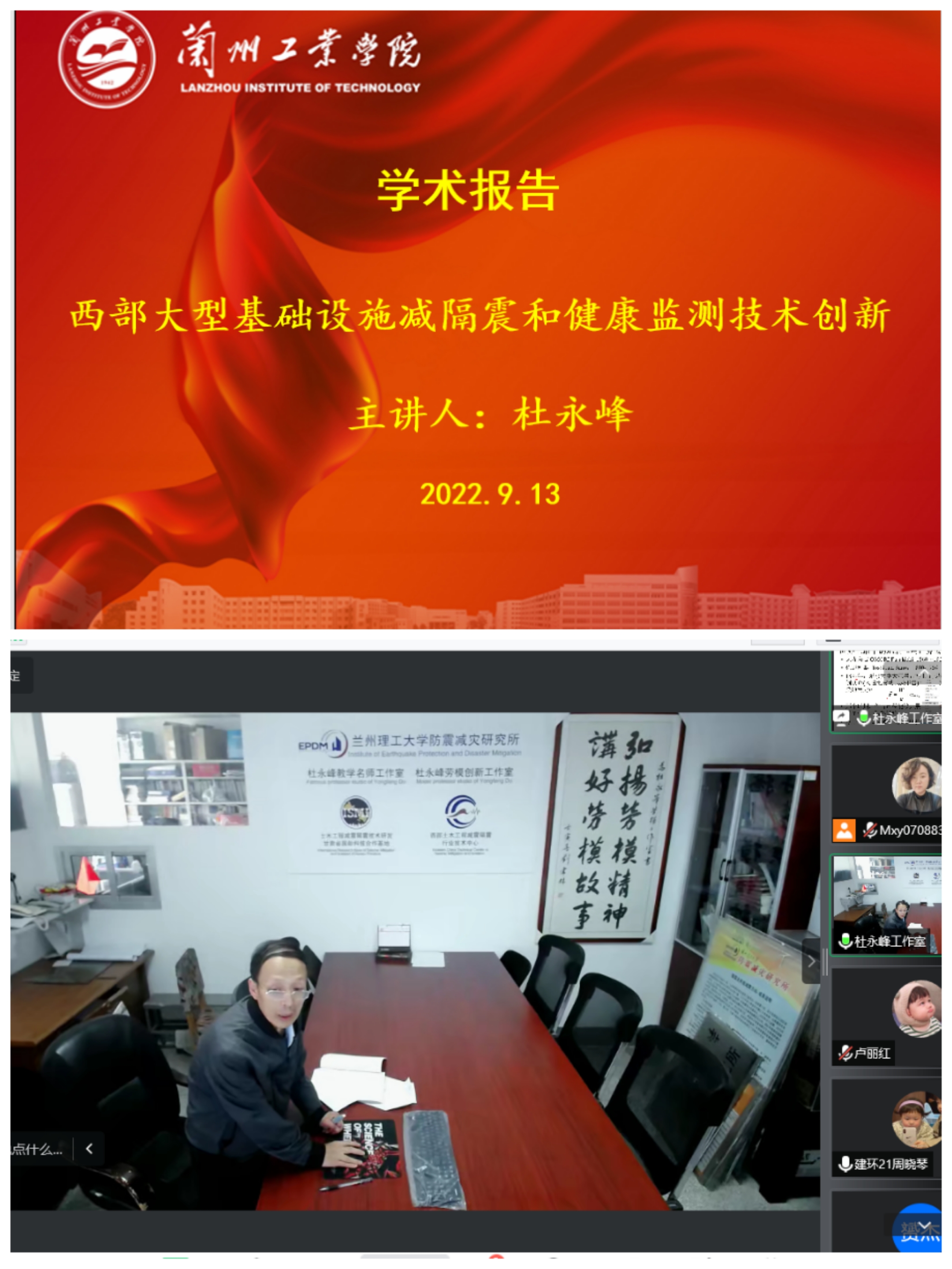 9月13日下午,土木工程学院举办庆祝建校80周年线上学术报告会。兰州理工大学防震减灾研究所所长杜永峰教授应邀作题为《西部大型基础设施减隔震和健康监测技术创新》的学术报告。