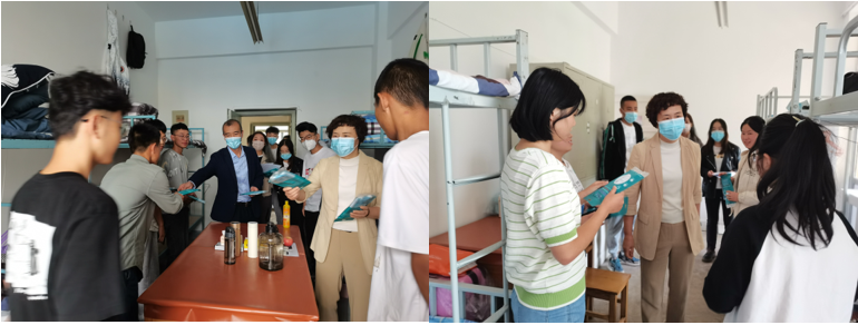 陈芳一行来到新生宿舍,代表学院向同学们送上开学的祝福,将口罩、消毒液等防疫物资送到每个学生手中,并与学生们亲切交谈,询问对大学生活以及宿舍生活环境的适应情况,并叮嘱学生们做好自我保护。他们希望同学们友爱互助、尽快适应大学生的新角色;要勤奋上进,多加锻炼,强身健体,好好学习,快乐生活;要珍惜大学时光,规划好学习和生活,度过充实而有意义的大学时光。
