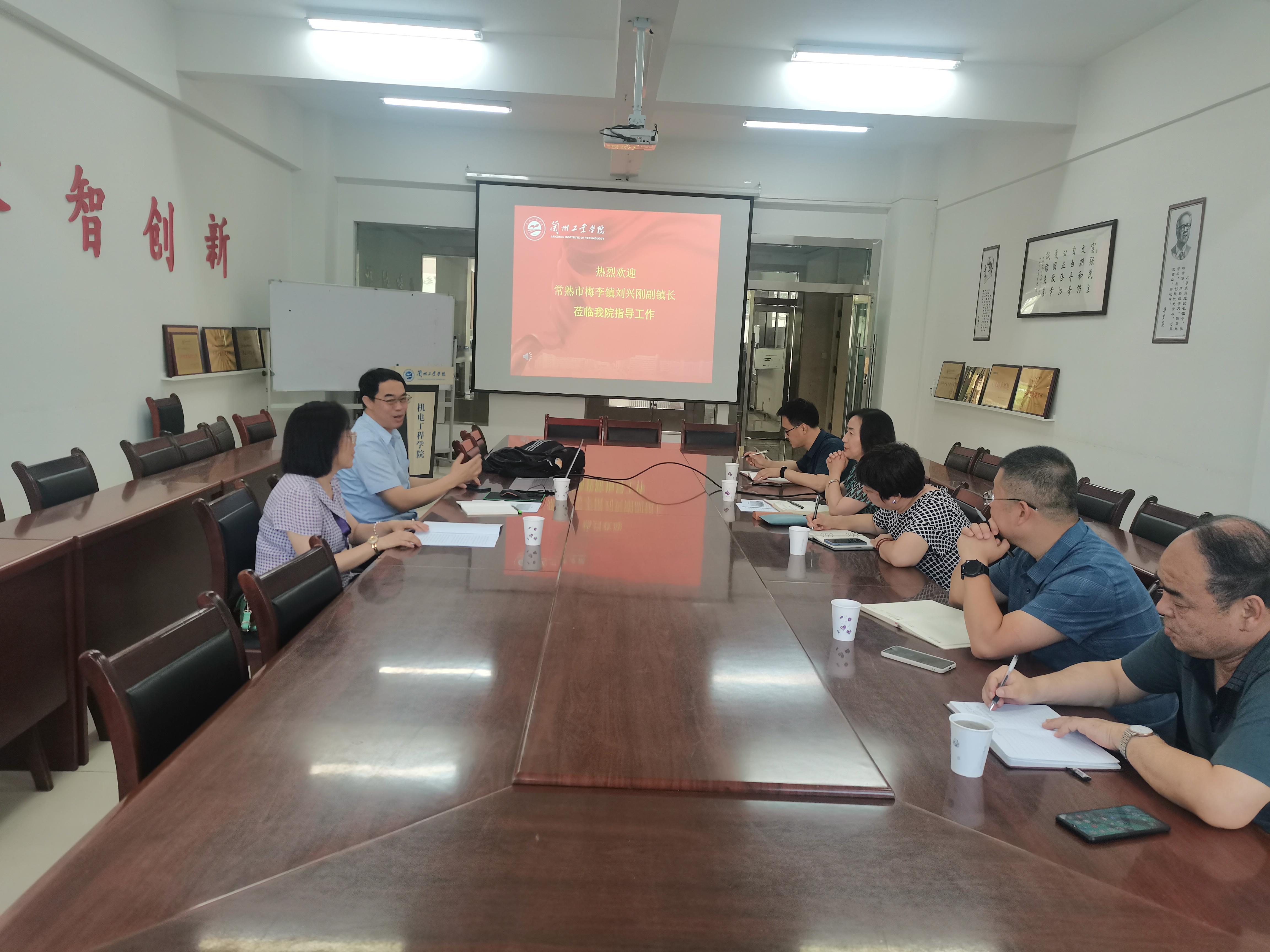 6月29日上午,江苏省常熟市梅李镇副镇长刘兴刚到机电工程学院洽谈装备制造专业人才引进、产线深度合作事宜。校党委委员、统战部部长张红岩主持会议。