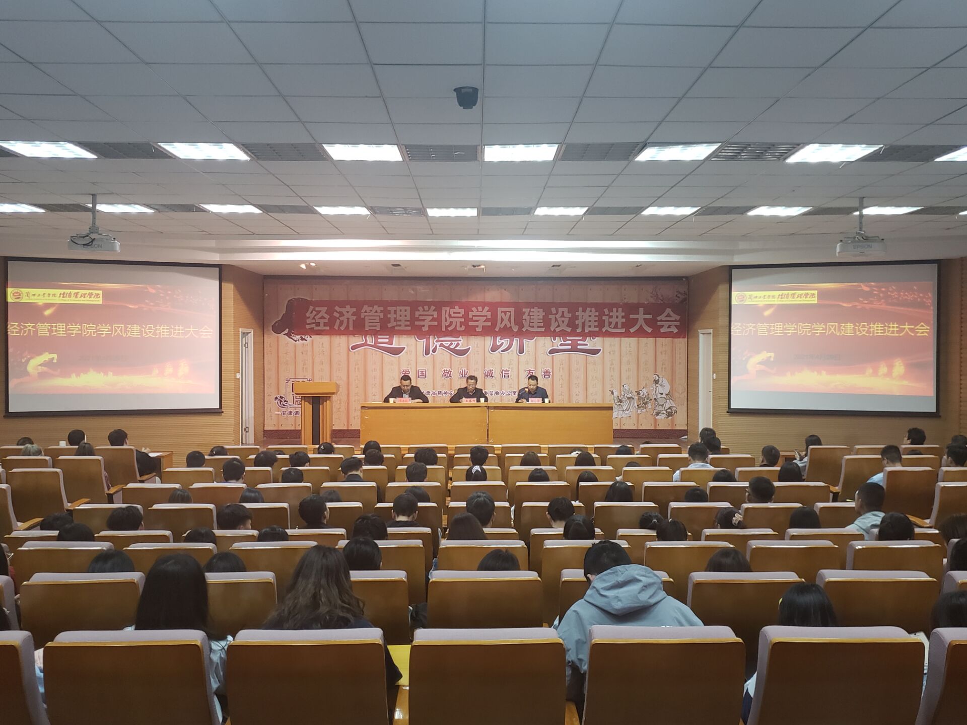 4月29日下午,经济管理学院在道德讲堂召开学风建设推进大会。学院党委书记王春升、院长戴德锋、各专业教研室主任、全体辅导员,全体学生干部、党员以及大一全体学生参加会议,会议由学院党委副书记、副院长牛永红主持。