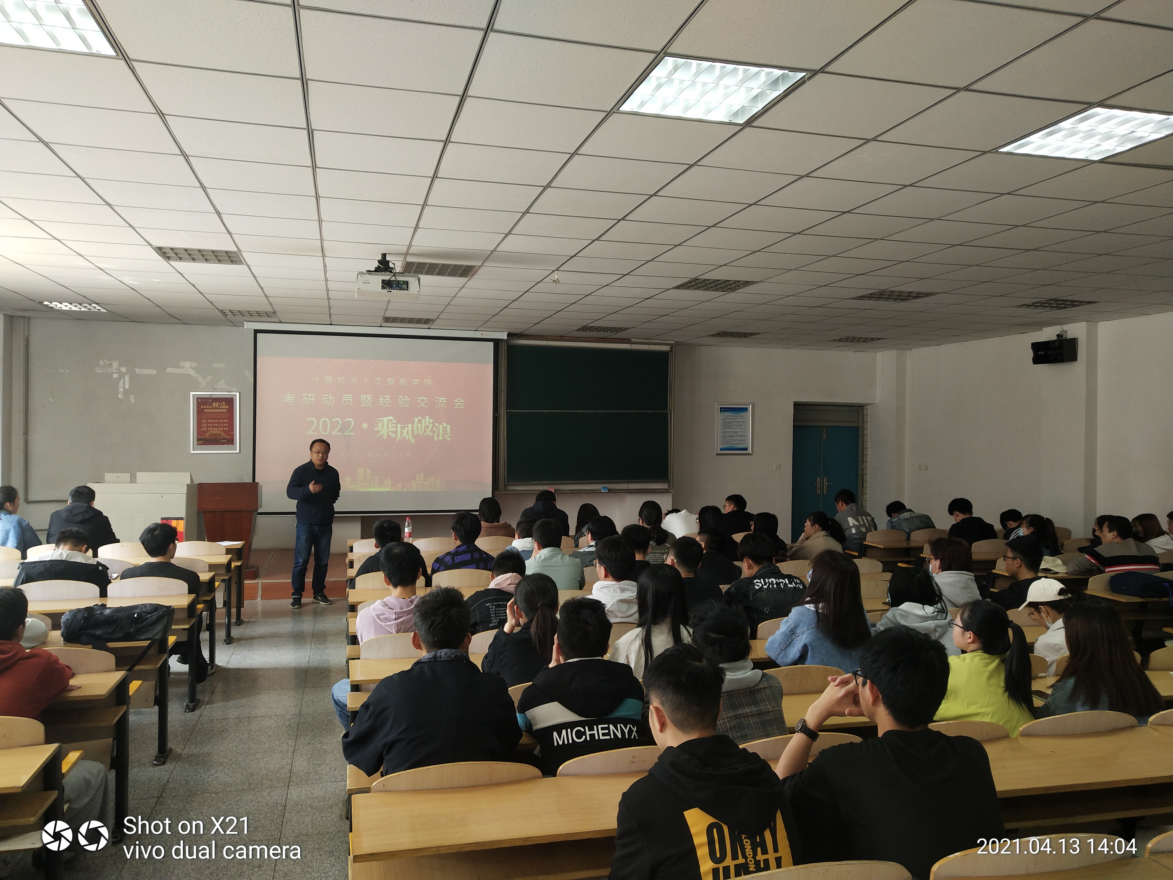 4月14日下午,计算机与人工智能学院在四教c101教室举行了2022年考研动员暨经验交流大会。2021年考取研究生代表,2018级、2019级有考研意愿学生共计150人参加了会议。