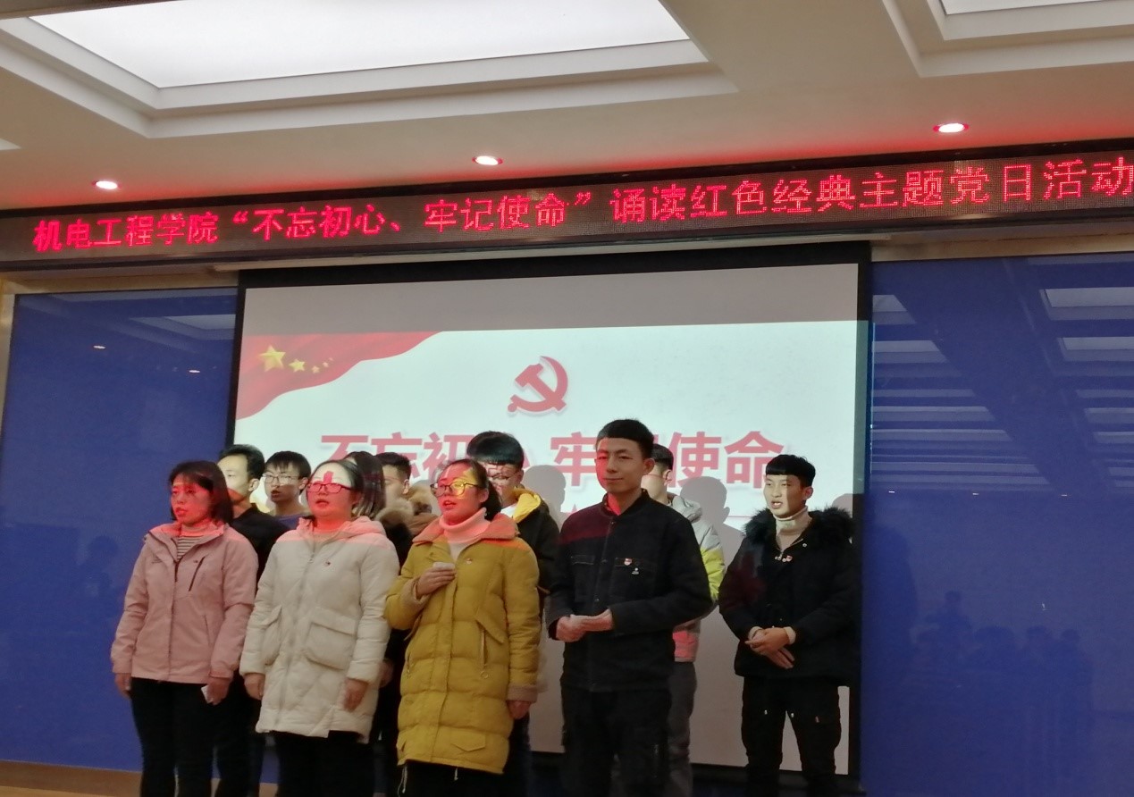 2019年12月24日下午,机电工程学院4个学生党支部在第一学术报告厅联合开展“不忘初心、牢记使命”诵读红色经典主题党日活动。学院党委书记赵礼栋,党委副书记、副院长杨永萍,组织员马俊年和全体学生党员110余人参加了活动。