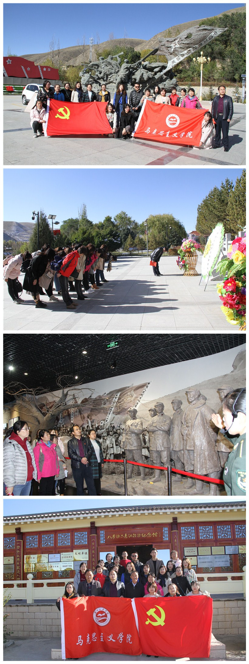 此次主题党日活动把“不忘初心,牢记使命”的主题教育活动与思政课教师的“传承红色基因”实践研修活动结合起来,采取重温入党誓词、向英烈敬献花篮、现场实践教学等形式。在古浪战役纪念馆,全体教师触摸西路军敢于牺牲、宁死不屈的可歌可泣英雄史诗。在八步沙“六老汉”治沙纪念馆和治沙林场,全体师生党员亲身体验八步沙“六老汉”三代人护卫家园的苦干实干的担当拼搏精神、唯实创新的接续奋斗精神,感悟把沙漠变绿洲的伟大壮举。学院党总支书记王重贤、院长张小华与“八步沙”林场厂长郭万刚进行了交谈,全体师生与郭万刚厂长合影留念。