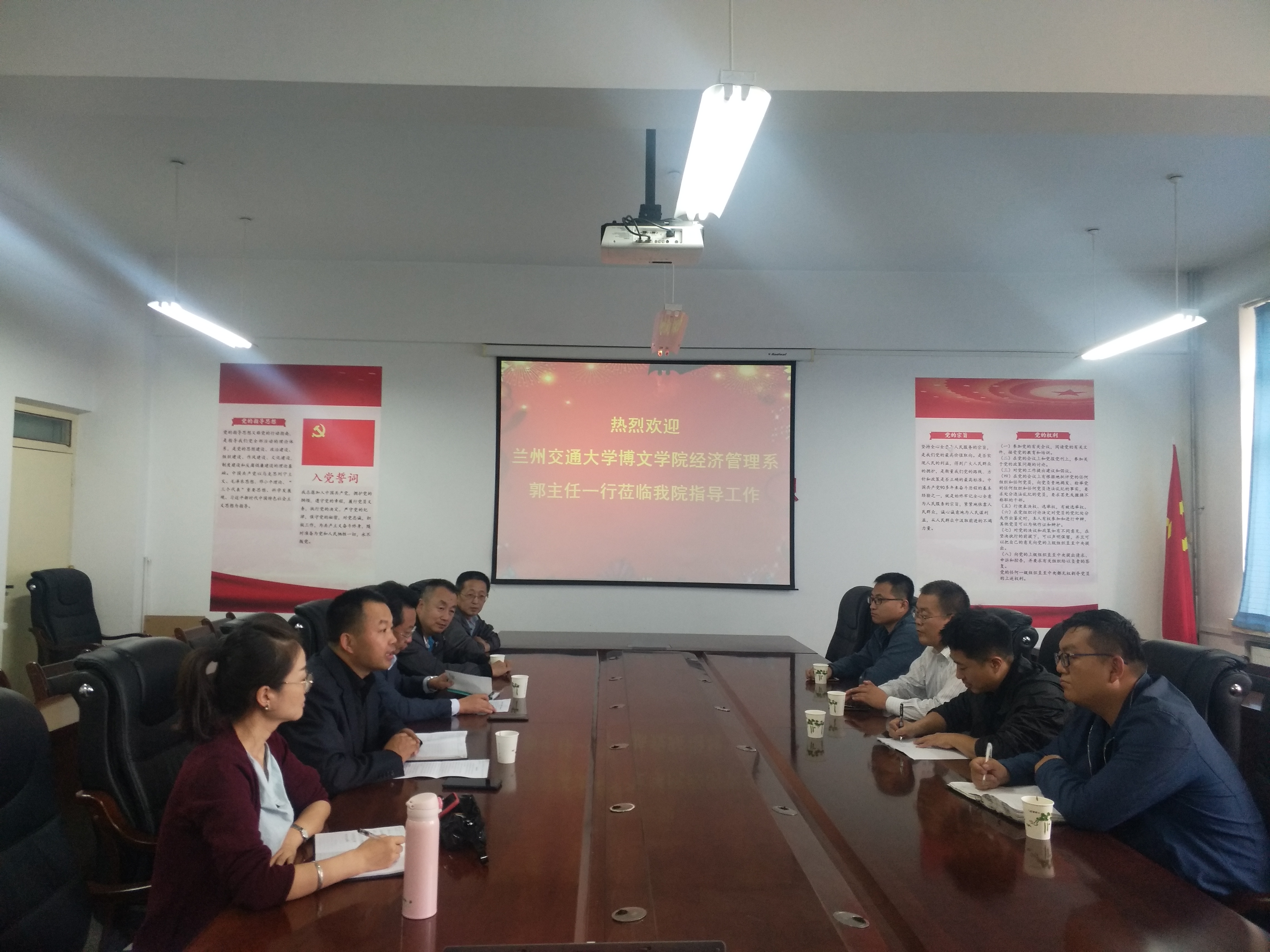 2019年9月12日,兰州交通大学博文学院经济管理系主任郭斌一行四人到学校经济管理学院调研交流。学院班子成员、学工办主任、实验中心主任参加了座谈会。 座谈会上,学院副院长戴德锋对兄弟高校同仁的来访表示欢迎。同时介绍了学院的历史沿革、师资人才队伍、实验室建设情况以及近几年来学院在科研、学科竞赛等方面取得的成绩。学院党委书记王春升就学生管理、学风建设、就业以及学生活动等方面与郭斌一行进行了交流。 郭斌对学院的热情接待和经验分享表示感谢,介绍了博文学院经济管理系的基本情况,希望今后在学科建设、学生管理、实验室建设管理等方面加强合作与交流。 座谈会后,郭斌一行参观了学院实验室。