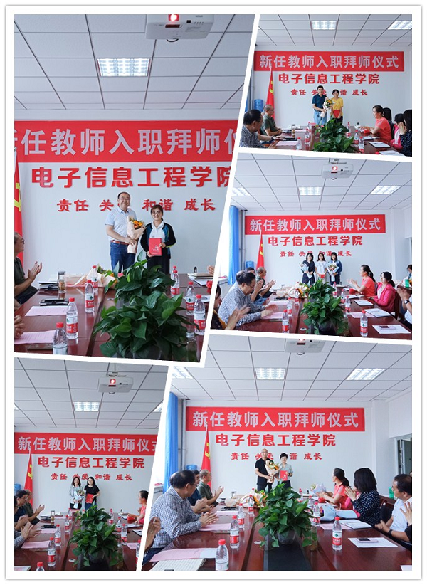 学院院长周征宣读了《电子信息工程学院关于为2019年新任教师配备职业导师的通知》,新入职教师给导师献花拜师,各位导师为新入职教师赠书,李贵山为新任教师颁发了校徽。新入职教师代表吴红娟、导师代表赵又新作了发言。