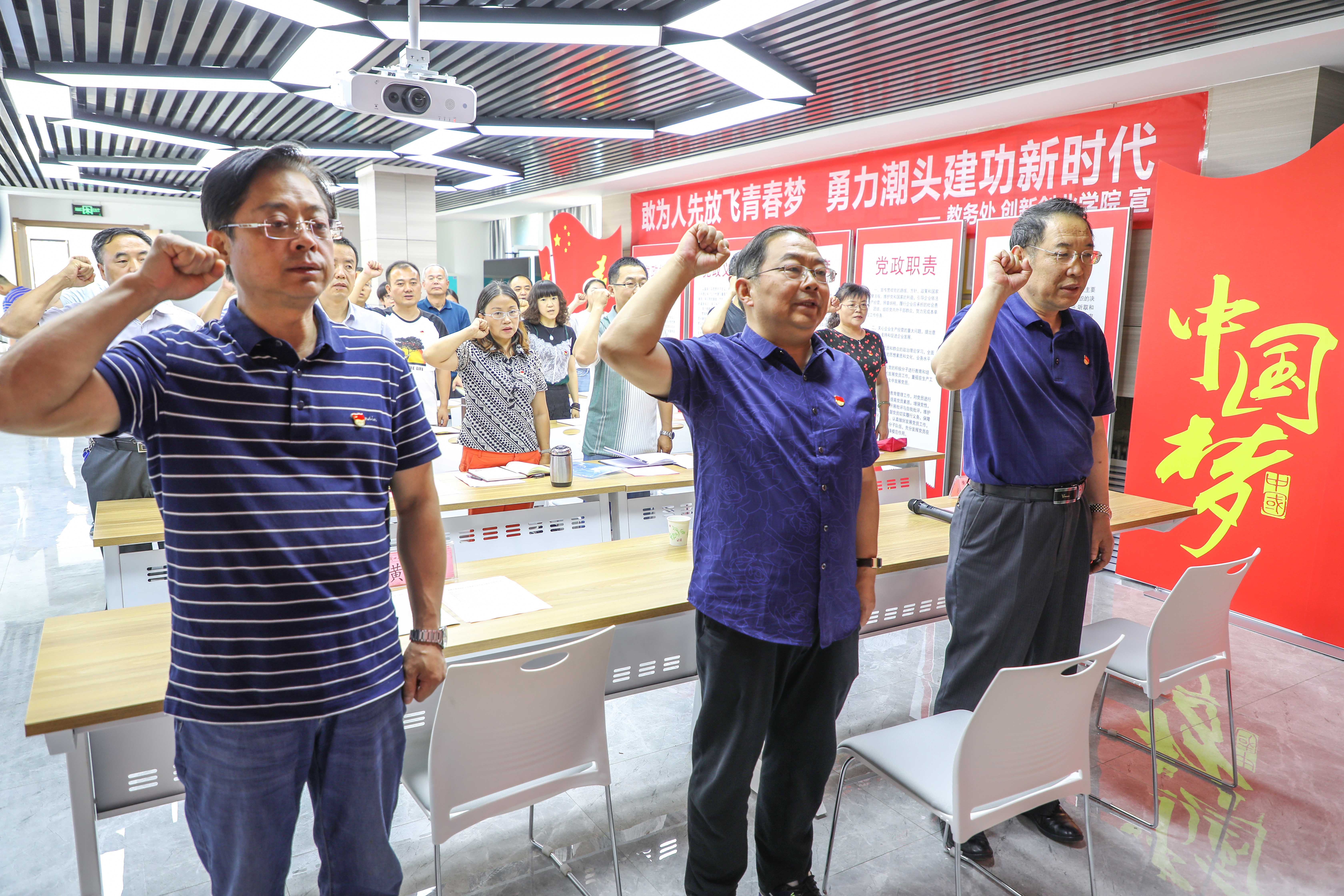 活动中,俞子泓、黄荟铭、李贵山等校领导为机关党委第五党支部党员活动中心揭牌,活动中心位于学校创新创业学院,是一个集信息展示、会议室、录播教室为一体的高标准多功能厅。随后,全体党员面向党旗重温了入党誓词,表达了党员们不忘初心,牢记使命,紧密团结在以习近平同志为核心的党中央周围,为实现中华民族伟大复兴而努力奋斗的信心和决心。