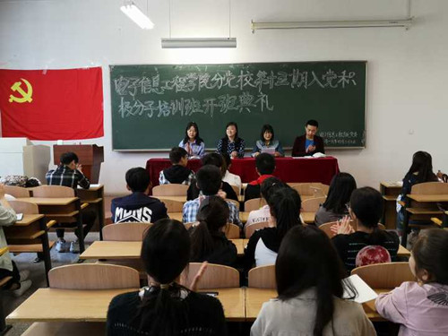 2019年4月23日,电子信息工程学院分党校在第四教学楼A204教室举办第十五期入党积极分子培训开班仪式,学院党委书记李萍、学生支部书记及本次培训班的全体学员参加了开班仪式。 开班仪式上,学生第二支部书记宣读了《关于举办党校第十五期入党积极分子培训的通知》,详细介绍了本次培训课程的具体内容,强调了培训班的学习要求和纪律。通信18-2班郭灏同学代表全体学员发言,表明学习态度和决心。 仪式结束之后,党委书记李萍以《青年成长与历史担当》为题,为学员们讲授了开班第一课。即将开展的培训还安排了《端正入党动机,争做合格党员》(主讲人:王永喜)、《十九大宣讲之乡村振兴战略》(主讲人:汤艳春)等主题培训内容。