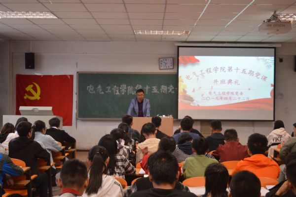 2019年4月22日晚,电气工程学院分党校在第一教学楼A401举办第十五期入党积极分子培训开班典礼。84名入党积极分子参加了典礼。 开班典礼上,学院党委书记刘保录详细介绍了本次培训课程的授课计划、具体内容、学习要求及纪律,并鼓励培训学员积极学习党的知识,严格遵守党课纪律。随后,刘保录围绕对党的认识、党的性质、党员条件、党的指导思想、党员的义务与要求等方面,详细讲述了《中国共产党章程》的内容。 此次培训让同学们对党的知识有了更加深刻的认识与了解,对同学们树立正确的世界观、人生观、价值观和荣辱观起到了积极作用。