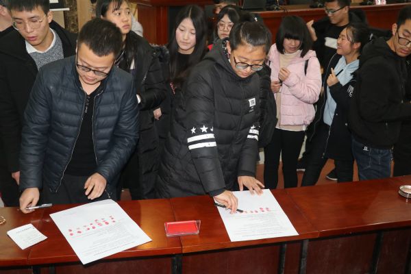 为加强学风建设,端正学生考试态度,12月29日下午,电气工程学院在第三学术报告厅举行2018级学生“考试诚信承诺书”签字仪式。 签字仪式上,学院副院长张维玲宣读了《兰州工业学院课程考试(考核)工作实施细则》、《兰州工业学院学生违反考试纪律处分规定》;学工办主任通报了学院2017-2018学年学生考试违纪情况,并宣读了对考试作弊学生的处理办法,要求同学们引以为戒,不要以身试法。优秀学生代表电气15-2班廖静怡同学分享了考前复习经验;新生代表电气18-2班郭泰同学宣读了《电气工程学院考生诚信考试承诺书》。学院党委书记刘保录在总结讲话中强调了大学生要“诚实做人,诚信考试”,并对2018级各班级提出了争创考试零作弊的要求。 会后,2018级全体学生签订了“考试承诺书”,并按下自己的手印。