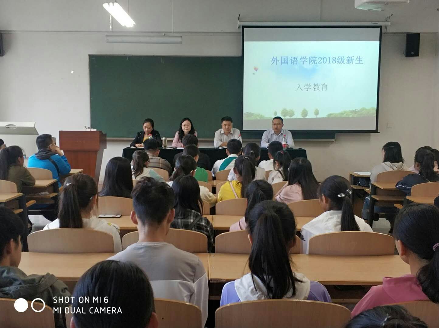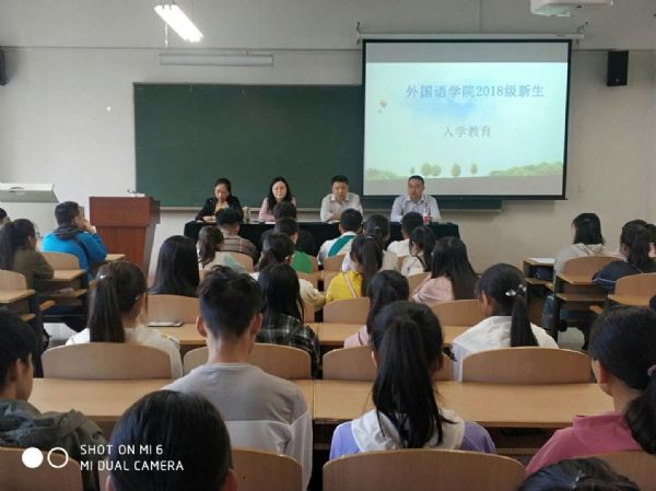 9月6日上午,外国语学院在四教A401召开2018级新生入学教育大会。学院院长刘玮、党总支书记文泽华、院办、学工办全体辅导员、班主任及2018级全体新生参加了大会。会议由副院长夏增亮主持。 会上,刘玮对学院的师资、专业设置等基本情况作了详细介绍,并对大家今后的学习提出了一些建设性的建议;文泽华在讲话中要求同学们修身立德,严格自律,内外兼修,注重日常养成,做到知行合一;希望大家用自己的青春谱写动人的大学之路,用行动创造精彩的大学生活。 根据学院安排,军训结束之后将由院学工办向18级新生介绍学生日常管理工作及院主要团学活动。通过入学教育等系列活动,旨在使新生对大学有新的认识,能够尽快适应新的学习环境,以良好的精神状态开始大学学习生活。