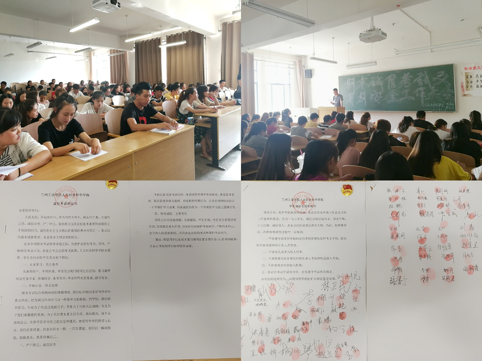 为做好2018年春季学期考试工作,7月13日下午,马克思主义学院、人文社会科学学院在四教A601举行了"温书迎考,诚信考试"动员大会。马克思主义学院全体辅导员、班主任、学生参加会议。 会上,参会人员集体学习了《兰州工业学院大学生手册》有关考试内容、宣读了《诚信考试倡议书》、签订了《诚信考试承诺书》,并通过讲述实际案例、全体同学宣誓等方式,向学生们强调了诚信考试的重要性,要求学生遵守校规校纪,认真复习备考,以扎实的知识、求实的态度迎接考试,争取考出好成绩,圆满完成本学期学习任务。