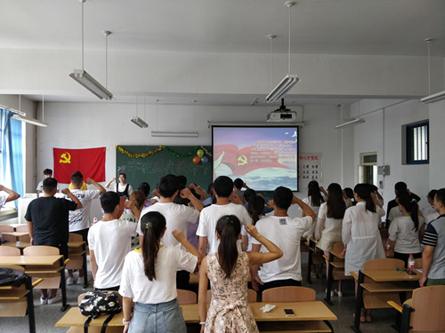 活动共分三个篇章,在雄壮的国歌声中拉开帷幕。第一篇章由支委成员孟雅静带领新发展的预备党员进行入党宣誓,所有党员重温入党誓词。右手拳头紧握,声音铿锵有力,铿锵恢宏的誓词,强烈震撼着在场的每一位党员,一字一句都体现了党员同志们对党的无限忠诚。第二篇章全体党员共同观看《网红为你说党史》,进行了一次穿越之旅。在教师徐川严谨而不失幽默的讲述中大家亲历了中国共产党的发展历程,同时也感受到了祖国日新月异的变迁,全体党员的责任感、使命感、紧迫感油然而生。第三篇章共同学习党章第一章第三、四条党员的权利和义务,并对大学生党员的权利和义务进行了激烈的讨论,高尚的理想,真才实学的本领,实现中华民族伟大复兴的担当是每位学生党员权利和义务的浓缩。在场党员积极参与到每个篇章,朗诵《如果祖国需要》、《新时代、新征程》充分展示了青年党员的理想、抱负与担当,小合唱《没有共产党就没有新中国》唱出了对党的信仰与歌颂。