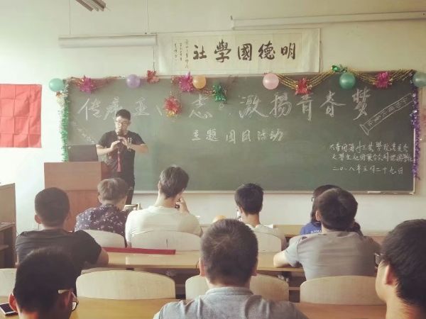2018年5月,大学生社团联合会明德国学社、博海棋牌协会、健美操协会、读者俱乐部、传承者剪纸协会等15个学生社团团支部举办了以“传承五四志,激扬青春梦”为主题的团日活动。 各学生社团团支部采取个人演讲、观看录像、文艺表演、小组互动的方式开展主题团日活动,进一步激发团员青年传承五四精神、争做新时代青年的热情,推动习近平新时代中国特色社会主义思想在青年中入耳入心,引导广大青年不忘初心、牢记使命,切实增强“四个意识”、树立“四个自信”。 学生社团团支部开展主题团日活动,旨在增进社团青年对团组织的归属感,巩固基层团组织建设,扩大团组织在学生社团中的有效覆盖。