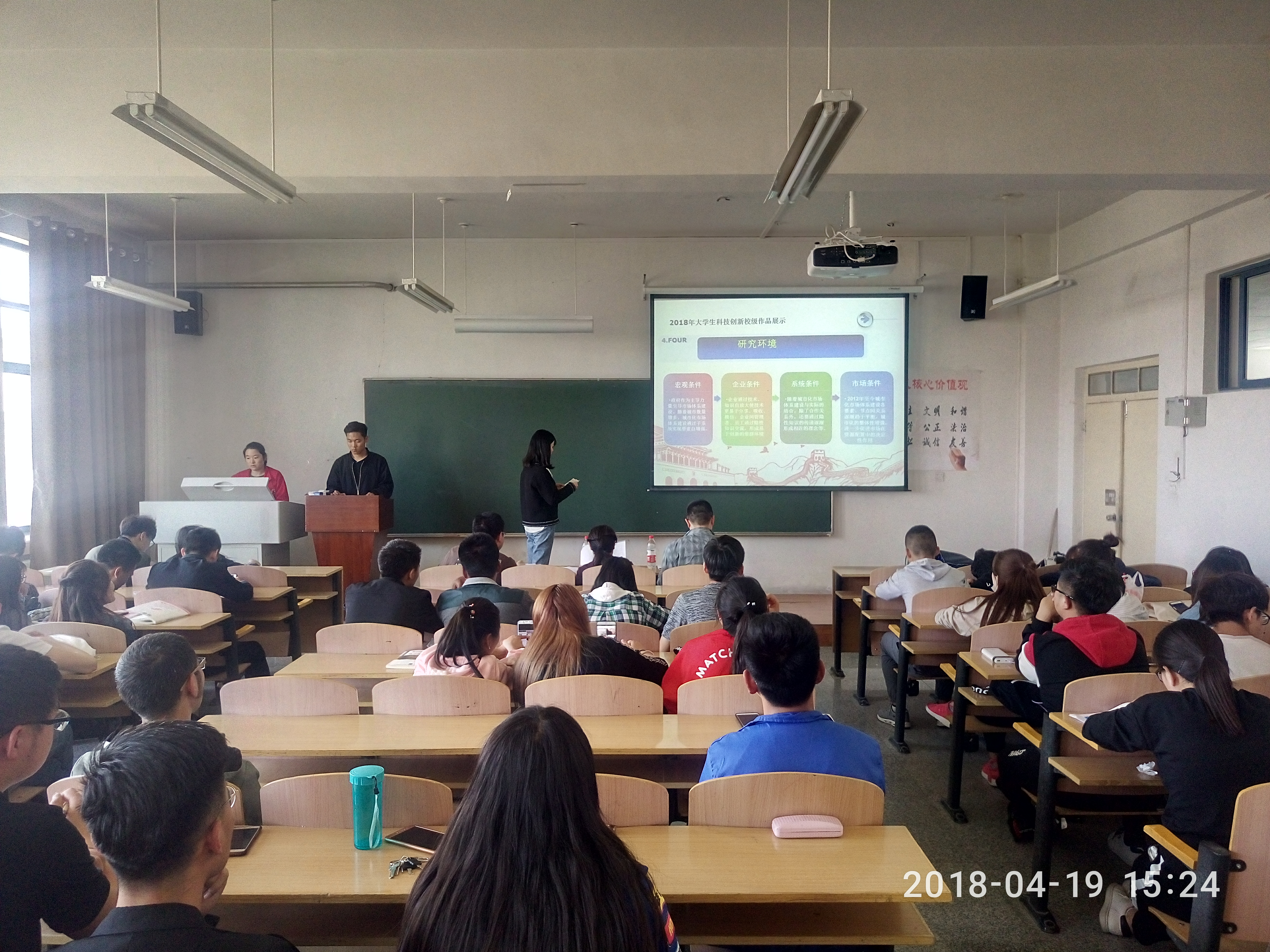 4月19日下午,经济管理学院在四教A602和A604召开2018年大学生科技创新项目立项学院初审答辩会。27个项目组参加了答辩。院长贾杰华、副院长牛永红等6位教师担任此次评委。 答辩会上,各组以ppt的形式围绕项目意义、研究内容、前期准备以及预期成果进行了答辩。评审教师对每个项目负责人进行了质询和点评,对同学们在科技创新立项中所付出的努力给予了肯定,着重对研究项目中所出现的问题以及可行性,向各组提出了意见和建议。最终按照大学生科技创新项目立项标准以及综合评委的意见,评选出10项申报项目。