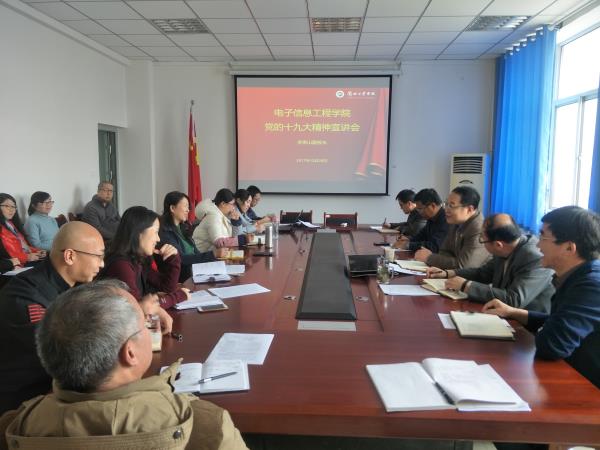 2017年12月29日下午,校党委委员、副校长李贵山为电子信息工程学院全体教师宣讲党的十九大精神。电子信息工程学院党总支书记刘保录主持宣讲会。