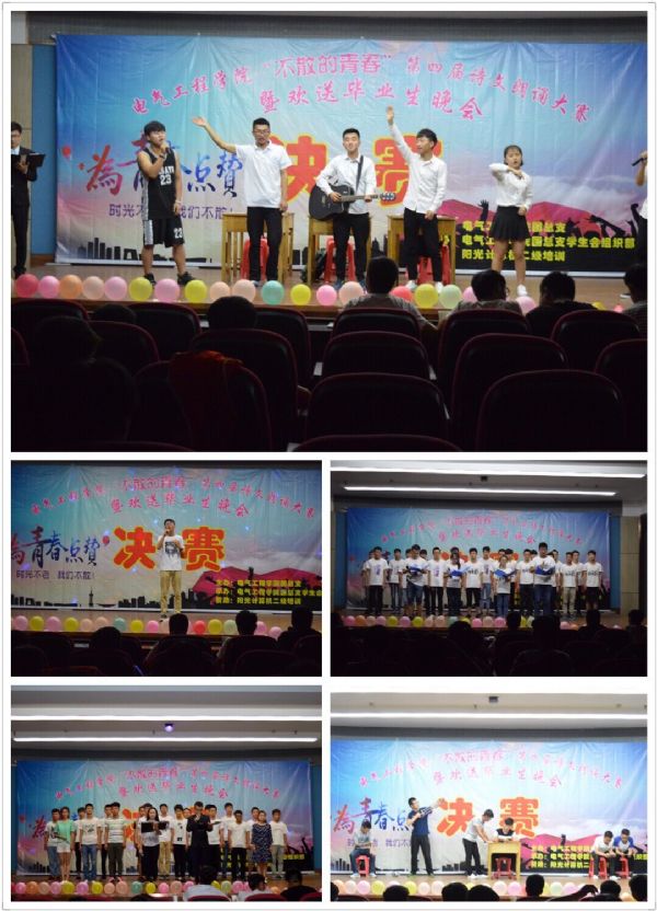 2017年6月13日,电气工程学院在八楼会议中心举行 “不散的青春”第四届诗文朗诵大赛暨欢送毕业生晚会。校、院学生会及相关社团负责人参加活动并担任评委。 前期,各参赛代表队认真组织、精心编排、积极参赛,共评选出八个参赛队晋级决赛。决赛中,同学们把合唱、情景剧等多种艺术形式与朗诵相结合,将大学生活搬上舞台,真情演绎了对校园时光、美好青春的眷恋以及对未来的憧憬。比赛现场气氛活跃,充满了欢声笑语,经过激烈角逐,最终自动化16-1班荣获一等奖,电气15-3班、电气15-4班联队荣获二等奖,电气16-2班荣获三等奖。