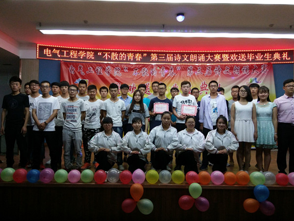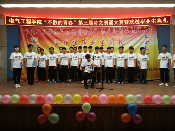 2016年6月17日,电气工程学院在八楼会议中心举办“不散的青春”第三届诗文朗诵大赛暨欢送毕业生晚会。 本次比赛历时一个月,经过各班的精心编排,共有9个参赛班级进入决赛。比赛中,各班将合唱、情景剧等形式多样的方式与朗诵结合,把大学生活搬上舞台,带给人阵阵感动。经过激烈的角逐,电气14-2班荣获一等奖、电气14-1班荣获二等奖、电气15-3班荣获三等奖。 此次活动的成功举办,不仅增强了班级凝聚力,丰富了校园文化生活,也为毕业生送去了我们最真挚的祝福。(供稿、摄影/电气工程学院)