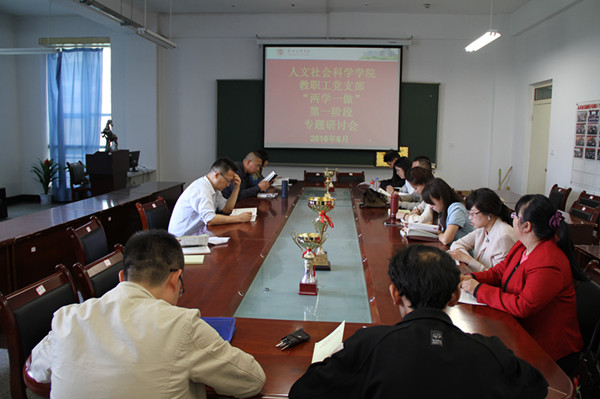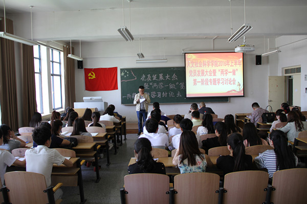 2016年6月2日下午,人文社会科学学院党总支在四教A616教室召开党员发展大会暨“两学一做”第一阶段专题学习研讨会。会议由学院副院长、党总支宣传委员张小东主持,全院教工党员、学生党员及入党积极分子参加大会。 会议首先讨论研究关于白鹏飞、郭佳昊等5名同志转正以及谭文丽等3名发展对象入党的问题。发展大会后,按照学院制定的“两学一做”学习教育实施方案,举行以“严守党章党规 规范党员日常言行”为主题的学习讨论会。与会党员表示通过第一阶段的学习,不仅提高了政治觉悟,加强了党性修养,更清醒地认识到“全面从严治党”的重要性。(供稿、摄影/人文社会科学学院)
