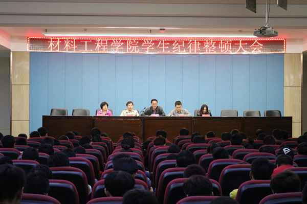 为了贯彻落实学校首届本科生教育质量考核验收评审工作动员大会精神,4月13日晚,材料工程学院在八楼会议中心召开学院学生纪律整顿大会。材料工程学院党总支书记韩国才、副院长贾魁,全体辅导员以及全院考勤较差班级以及违纪学生参加了会议。