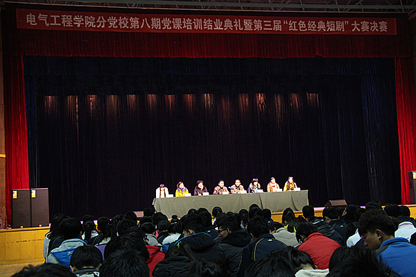 2015年12月22日下午,电气工程学院分党校第八期党课结业典礼暨第三届“红色经典”短剧大赛决赛在大礼堂举行。电气工程学院党总支书记吴安生、院长李双科、副院长王淑红、学生党支部书记牛玉婷和各级辅导员参加了本次活动。