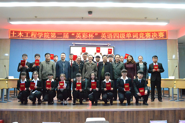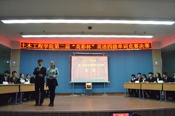 2015年12月2日晚,土木工程学院在八楼会议中心举办第二届“英彩杯”英语四级单词竞赛决赛。学院党总支书记赵万双、院长马守才观看了比赛,副院长陈玉梅、外教Josh、M.J及部分教师担任比赛评委。