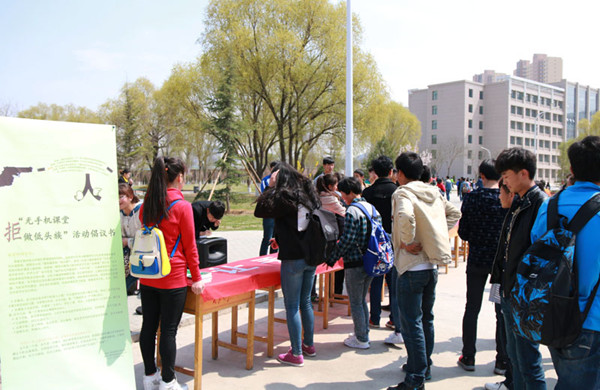 自3下旬以来,学院各团支部在主题团日活动中,从“低头”出现的原因、存在的危害、如何有效防止“低头族”现象以及手机对我们健康的危害和对课堂学习效率的影响等各方面展开了热烈讨论。同学们纷纷表示,在今后在学习和生活中要放下手机,以实际行动支持学院学风建设活动。4月7日中午,在北校食堂门口和南校实训楼下开展了横幅签名活动。过往的同学驻足观看展板、倡议书,认真聆听工作人员的讲解,并主动在宣传横幅上签名以表示对活动的支持和肯定。