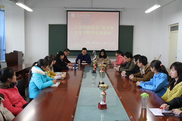 为进一步推动学院各项工作更好地开展,在全院形成良好的学习氛围,2014年11月19日下午,人文社会科学、马克思主义学院院长张小华、书记刘军、副院长张小东,年级辅导员以及各教研室主任和2012级、2013级、2014级三个年级的学生代表进行了交流与座谈,听取学生对教学、管理、服务等工作的意见及建议。