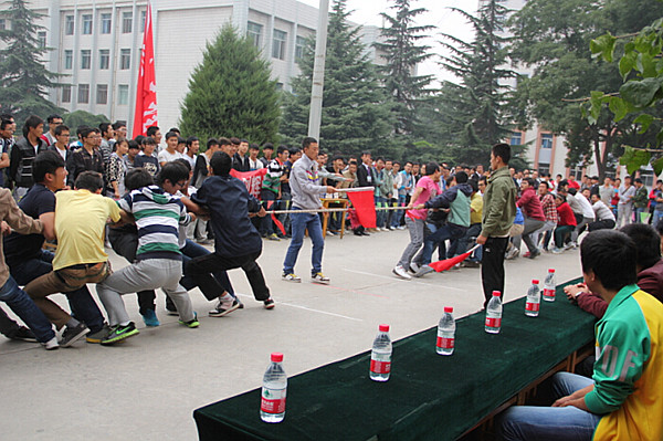 2014年9月26日,机电工程学院团总支学生会第十二届“金鹰杯”拔河比赛决赛如期在北校餐厅门口举行。学院一、二年级各班级组成20支参赛队参加了比赛。经过激烈角逐,最终机设14-5班获得冠军。