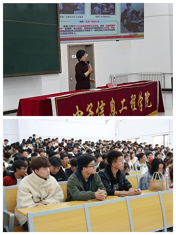 辛欢从学校创办背景、发展历程、学科特色等,向同学们介绍了红色校史中蕴含的理想信念、爱国情怀、革命精神,希望同学们赓续红色基因,传承红色薪火,筑牢理想之基、坚定强国之志、砥砺报国之行。她强调,同学们要放下手机,抬起头,多去看看周围的风景,和同伴交流思想,去认识世界、改造世界;要放下面子,走出去,在工作和学习中积极向别人请教,面对机遇,放下不必要的顾虑和杂念,勇敢地面对挑战;要放下得失,去感悟,不要在意昨天的遗憾,也不在意明天的焦虑,感悟当下的每一个瞬间。环境不会一直不变,人生也没有一帆风顺,同学们要始终明确目标,主动改变自己适应新环境,找准前进方向,全力奔赴、持之以恒,做一名奋进新时代的青年。