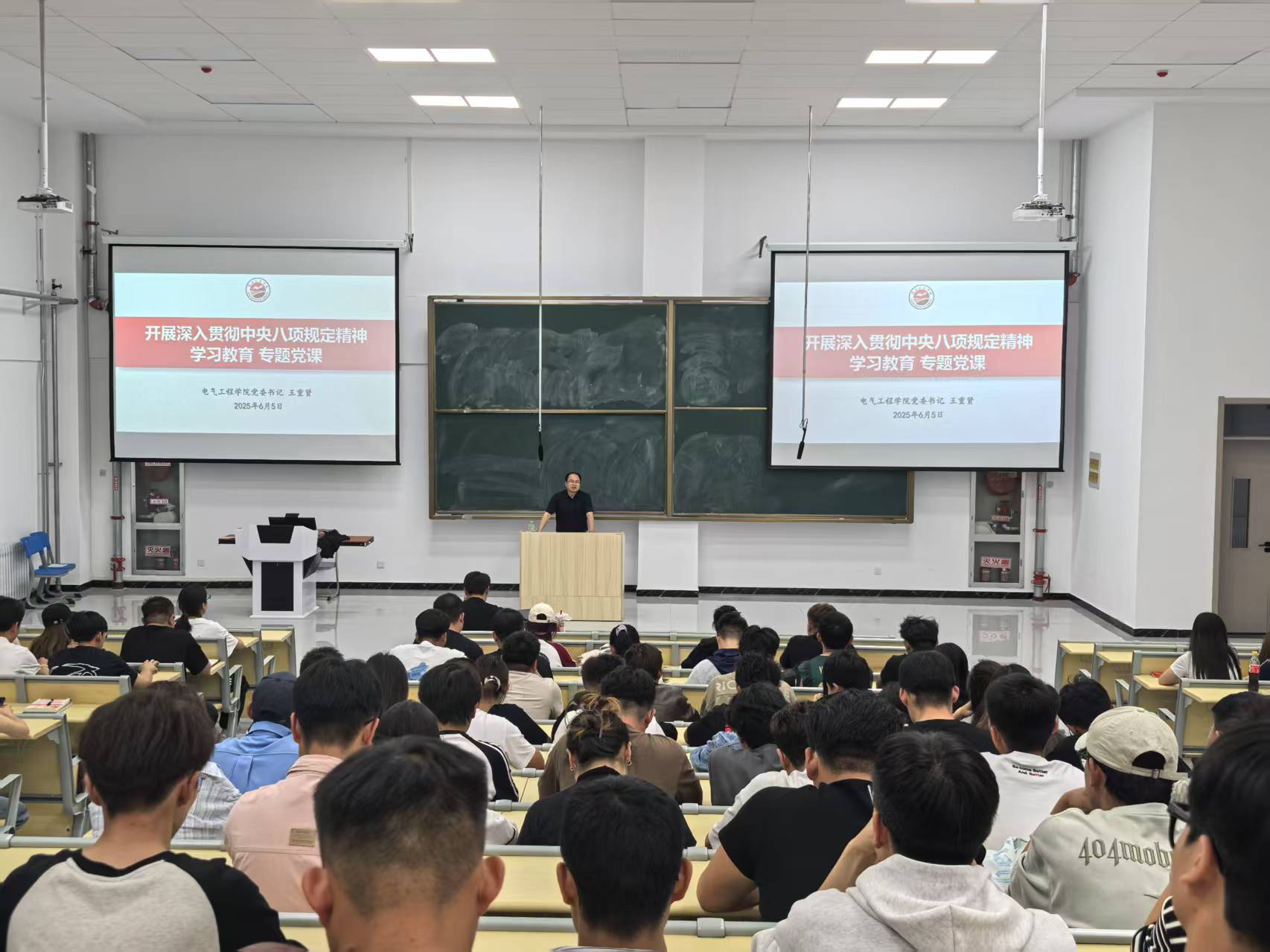 为高质量开展深入贯彻中央八项规定精神学习教育,推进作风建设常态化长效化,6月5日晚上,电气工程学院在公共教学楼E101举办深入贯彻中央八项规定精神学习教育专题党课,学院全体学生党员、预备党员共220余人聆听了党课。