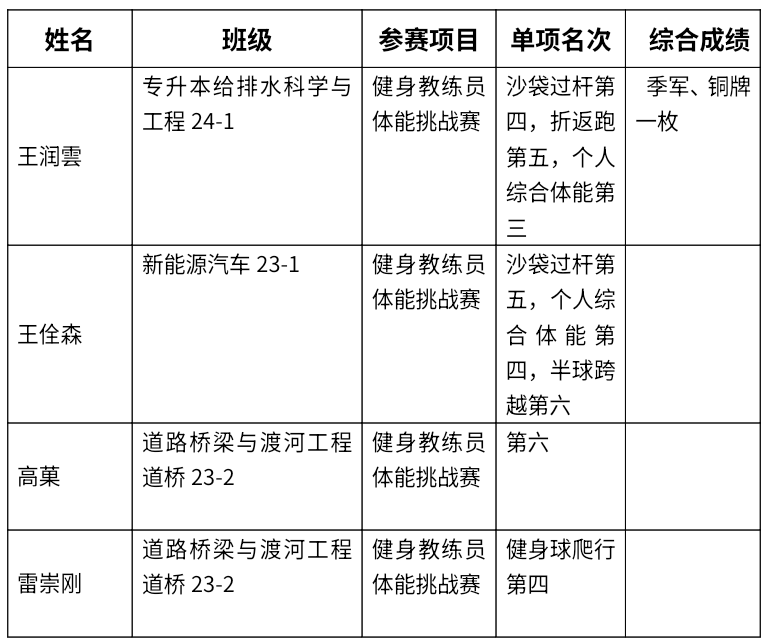9月13日-14日,甘肃省2025年体育行业职业技能大赛在省体工二大队举办,我校学子在健身教练员体能挑战赛中喜获个人综合成绩季军1个、个人分项第三名1个、个人分项第四名3个、个人分项第五名2个,团体综合排名第7。