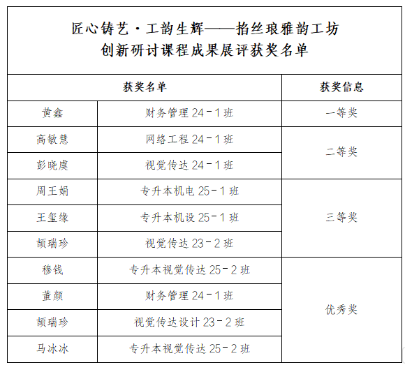 此次展评采用“线上+线下”综合评价模式。线上通过课程平台开展学生自评、互评与教师评分;线下展览期间,师生观众现场投票。最终评选出一等奖1名、二等奖2名、三等奖3名及优秀奖4名。