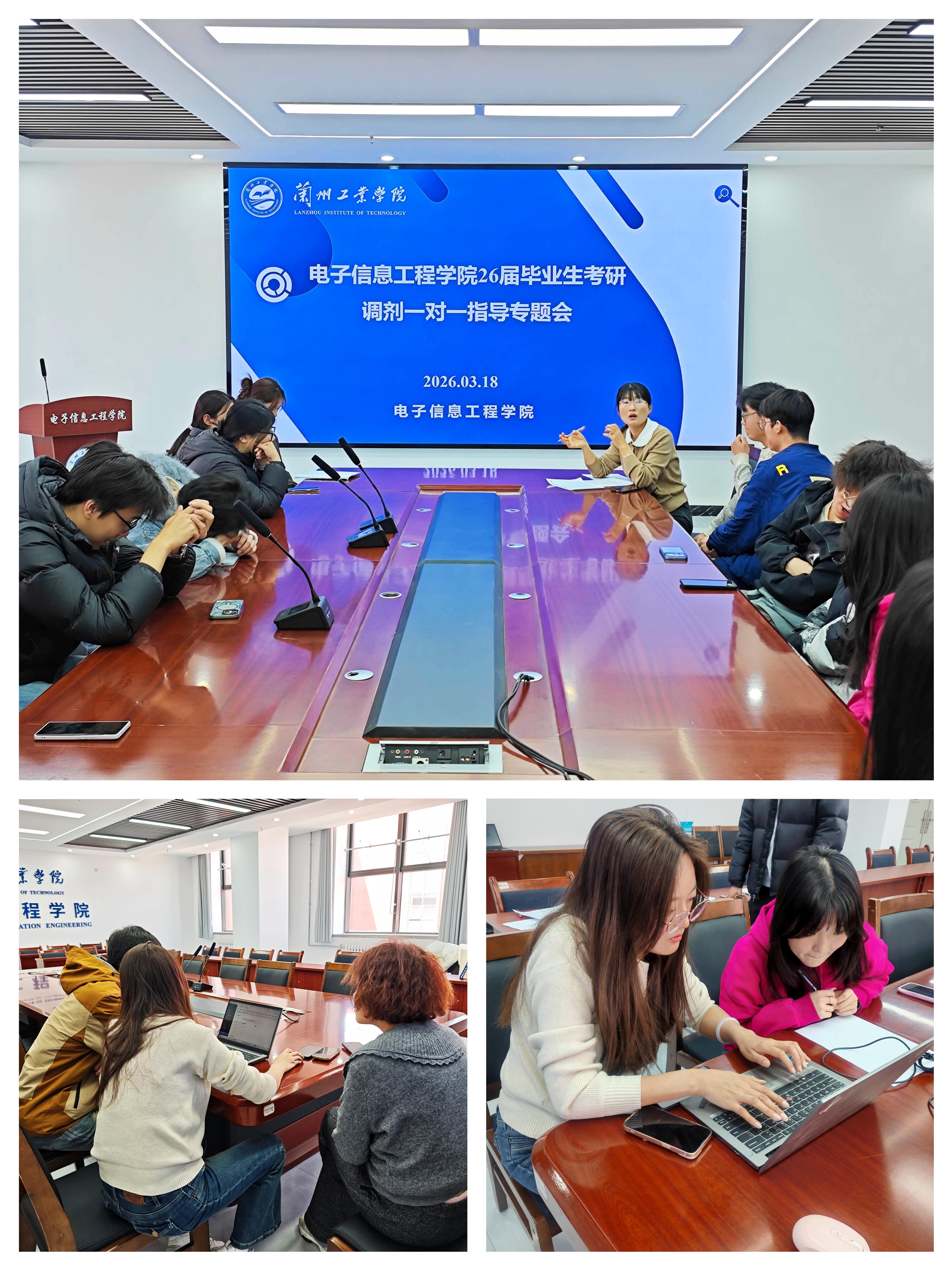 为切实帮助2026届考研上线学生理清调剂思路、掌握调剂技巧,解决复试与调剂阶段的核心困惑,3月18日下午,电子信息工程学院在北理工楼A408会议室召开2026届毕业生考研调剂一对一指导专题会。学院党委副书记、副院长彭琳茹,辅导员刘盼盼及全体考研上线学生参会。