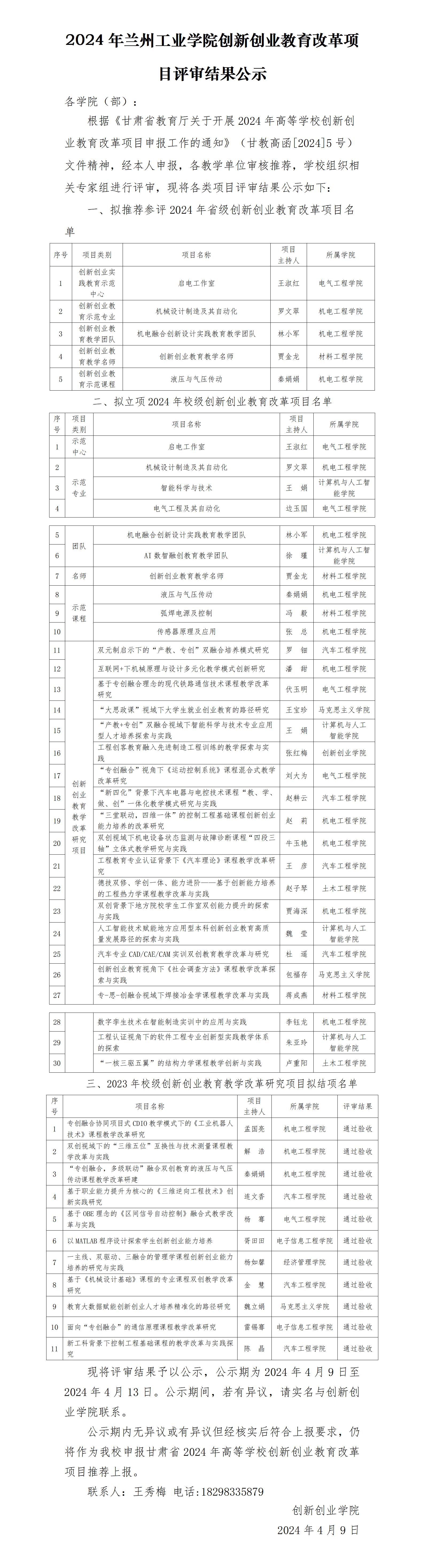 2024年兰州工业学院创新创业教育改革项目评审结果公示