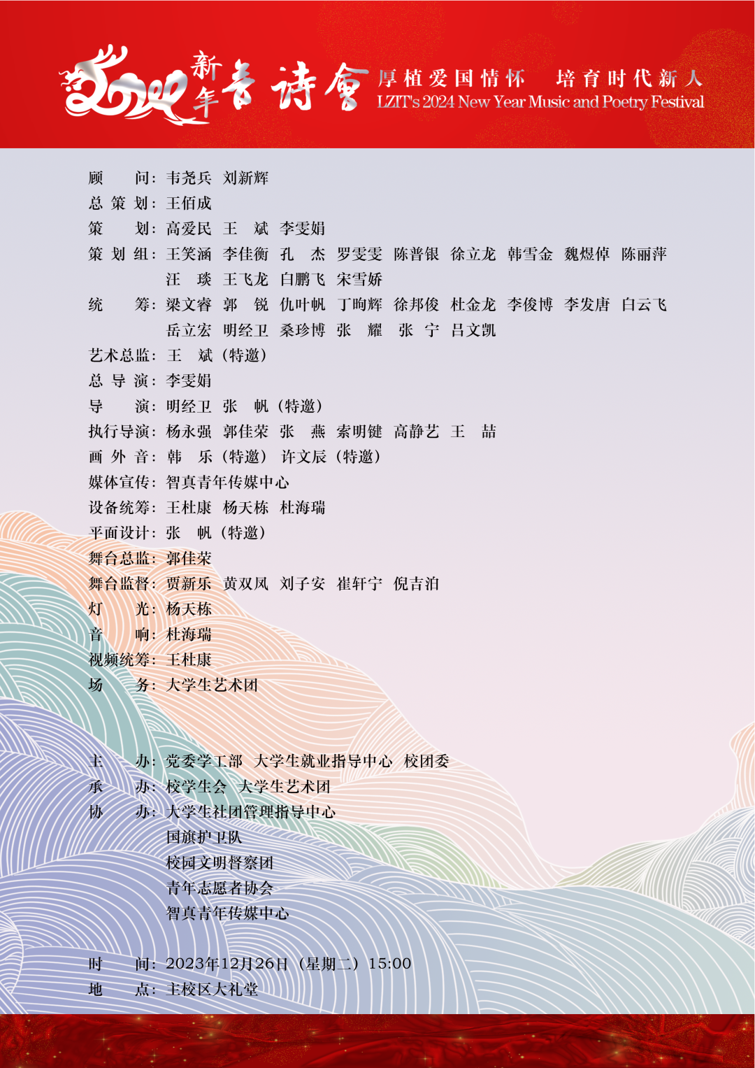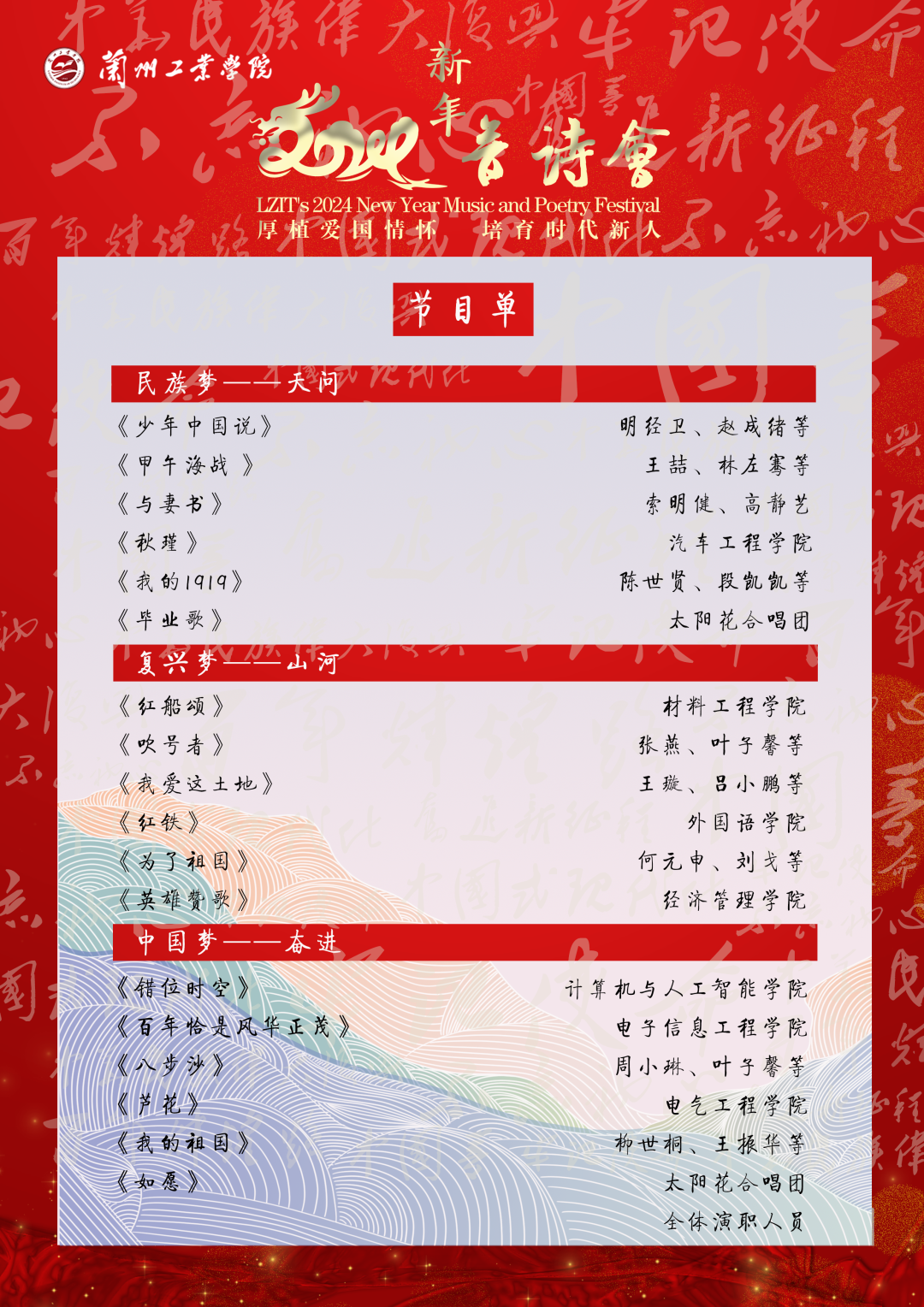 各单位、各部门: “厚植爱国情怀 培育时代新人”兰州工业学院2024新年音诗会将于2023年12月26日(星期二)15:00在主校区大礼堂隆重上演,欢迎广大师生前来观看!