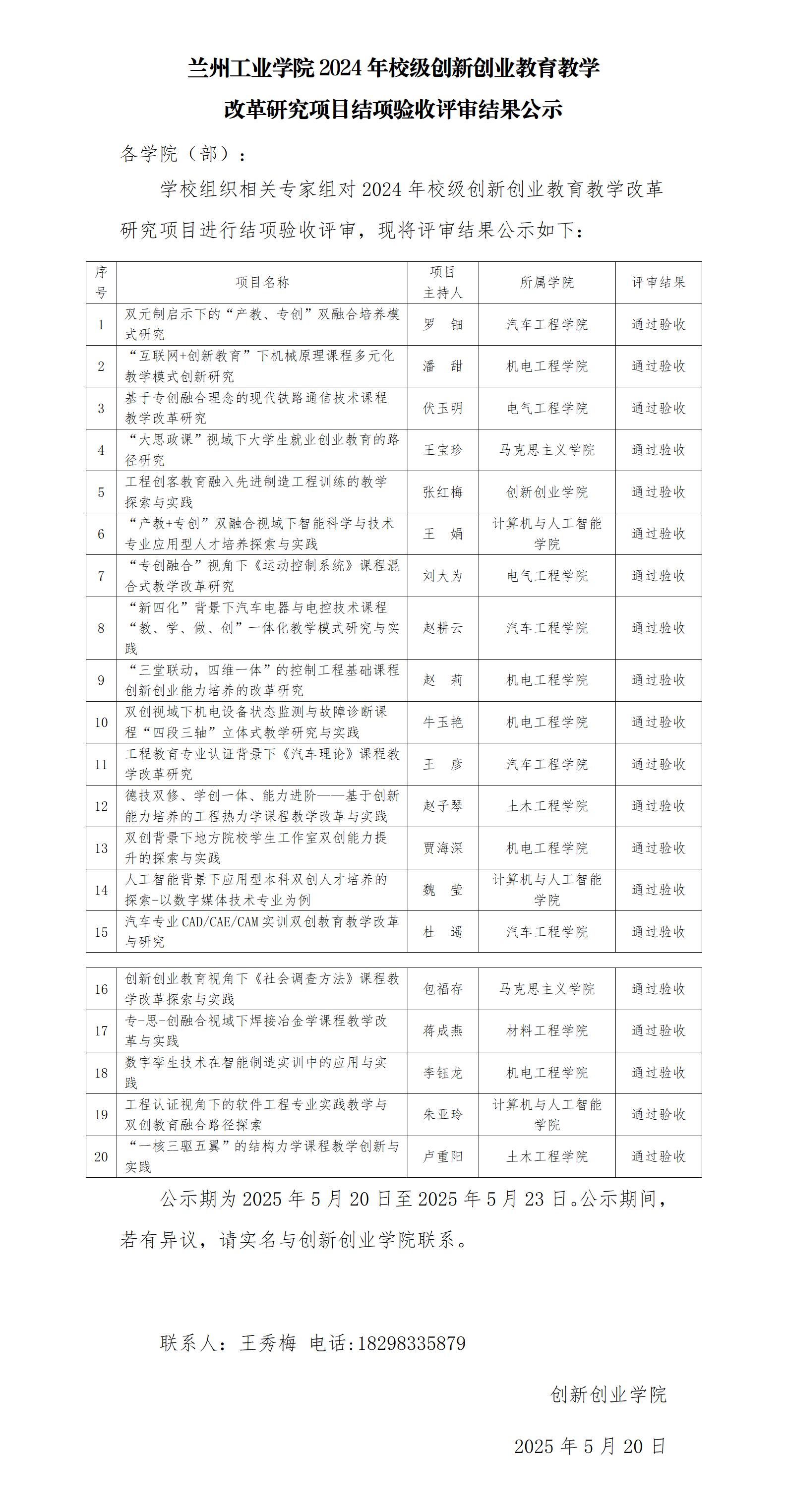 兰州工业学院2024年校级创新创业教育教学改革研究项目结项验收评审结果公示