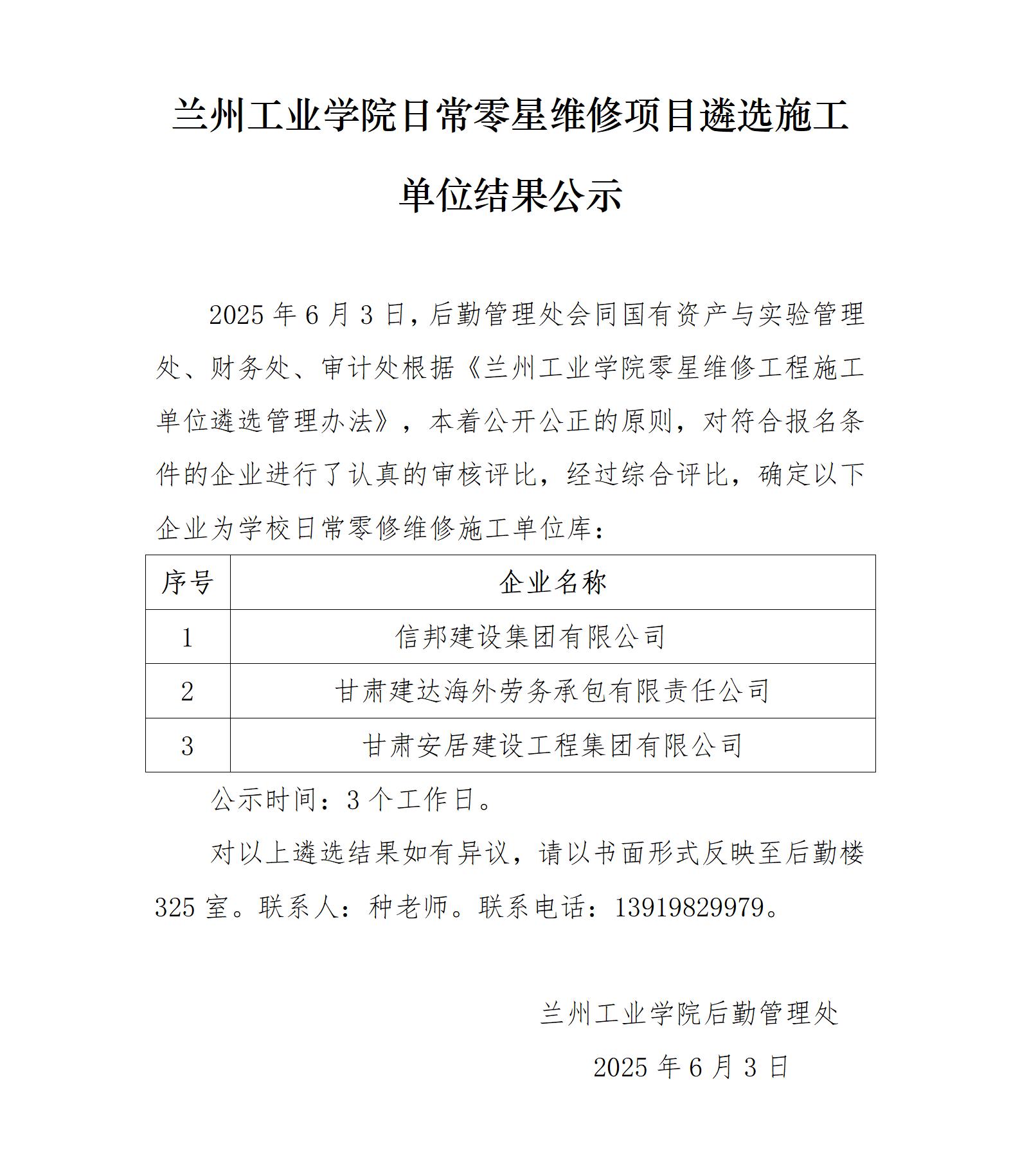 兰州工业学院日常零星维修项目遴选施工单位结果公示