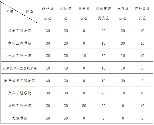 常规安全知识学习和考试需考生登陆兰州工业学院实验室安全考试系统,在线学习安全知识累计时长达5小时后,即可参加考试。考试时长为90分钟,共100道试题,由判断题和选择题组成,考试成绩达到85分及以上为合格,每位考生有3次考试机会,成绩取最高分记录。试题由计算机从题库自动抽取,各学院、部试题从题库抽取比例如下: